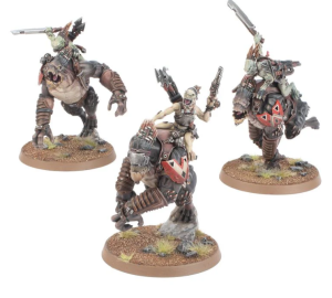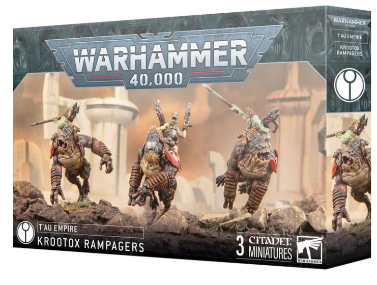 This multipart plastic kit builds three Krootox Rampagers, belligerent Kroot kin-beasts ridden into battle by daring alien warriors. The Kroot riders strike out from atop their steeds with pistols and long-handled blades, as well as quivers full of vicious hunting javelins. The Krootox themselves bound forward on muscular arms, trampling into enemies with prodigious strength and bellowing mass.
